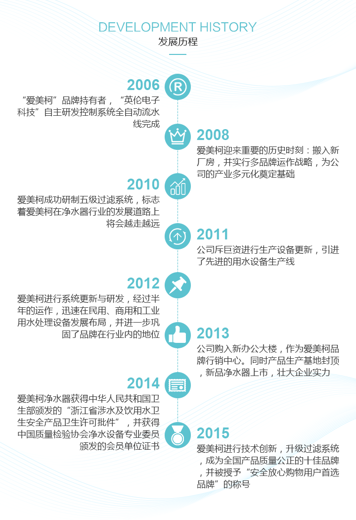 嘉兴英伦电器科技通过十年发展,拥有独立的制造基地和产品研发中心,下设两大事业部:电子事业部和净水器事业部,电子事业部主要服务于国内大中型企业的电器元件生产和制造。净水器事业部凭借公司在生产制造和科研创新上的积累,爱美柯净水器迅速成为国内具有影响力的品牌,产品品质和品牌形象广受用户喜爱。来自新加坡的产品创意团队对净水器行业具有敏锐的洞察力,公司在净水器核心技术反渗透膜(RO膜)的研发上,一直处于行业前端水准,2016年受邀成为行业标准起草单位。